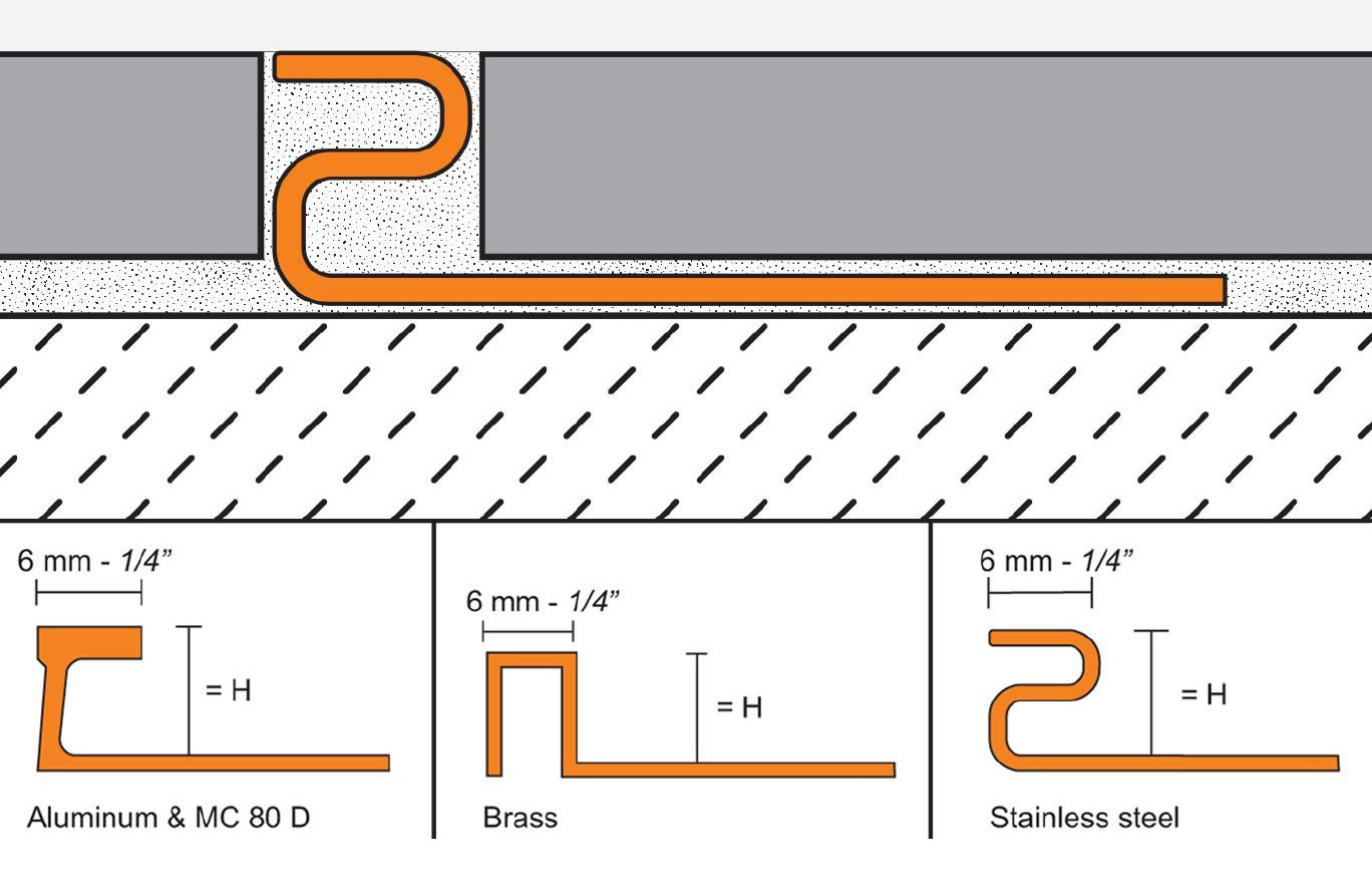 Schluter-DECO is available in stainless steel, solid brass, chrome-plated solid brass, and anodized aluminum.