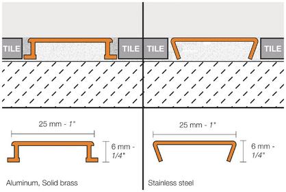 Schluter-DESIGNLINE is available in chrome-plated brass, anodized aluminum, and stainless steel.