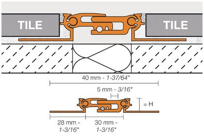 Description: Schluter DILEX-BT Expansion Joint Movement Profiles. Expansion Joint Profile that bridges expansion joints and accommodates movement with the 1-3/16" (30 mm)-wide telescopic center. 2.5 m (8' 2-1/2") Length; 8 mm-20 mm (5/16"-3/4") Heights are available. Made of Anodized Aluminum.