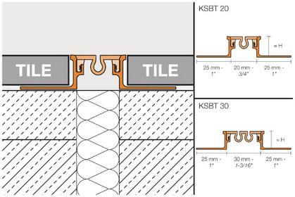 Description: Schluter DILEX-KSBT Expansion Joint Movement Profiles. Bridges expansion joints, protects tile edges; 3/4" (20 mm) or 1-3/16" (30 mm)-wide movement zone. 2.5 m (8' 2-1/2") Length; Heights of 8 mm-30 mm (5/16" - 1-3/16"). Anchoring legs made of stainless steel, solid brass or aluminum. 3 colors available for the visible surface.