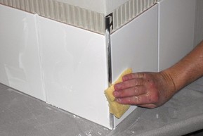 - Using a notched trowel, apply thin-set mortar to the area where profile is to be placed. If Schluter-RONDEC is to be used as edging for an outside wall corner, finish tiling one wall first; then trowel thin-set mortar over the corner area of the second wall.